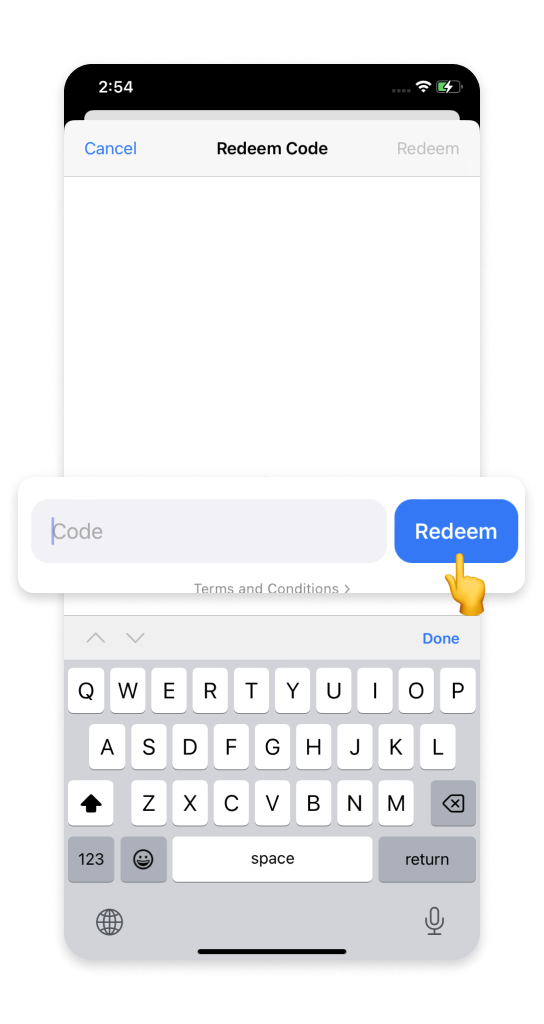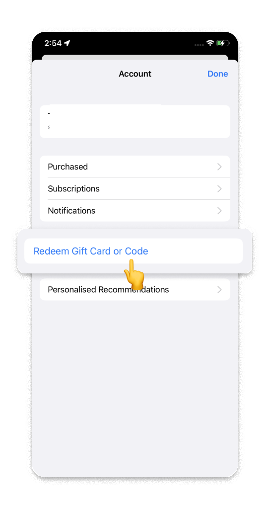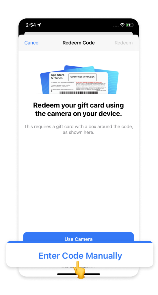 기프트 카드 코드를 등록하려면, 앱스토어 상단 프로필을 클릭한 후, "Redeem gift card or code"를 선택합니다. "Enter Code Manually"에서 코드를 입력하고 "Redeem" 버튼을 눌러주세요.
