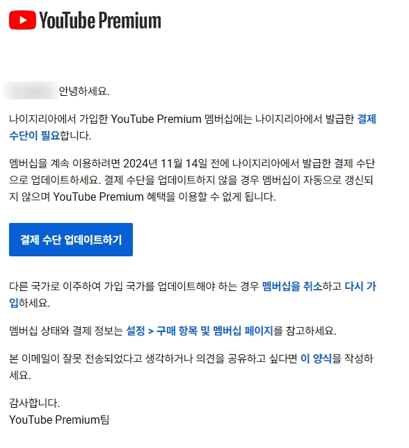 유튜브 숙청 메일: 결제 수단 업데이트 안내