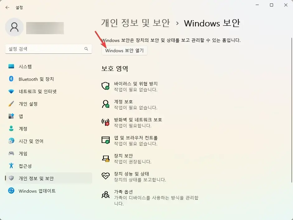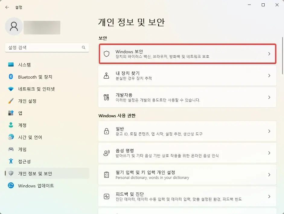 2. 개인 정보 및 보안을 클릭한 후 Windows 보안을 선택합니다.