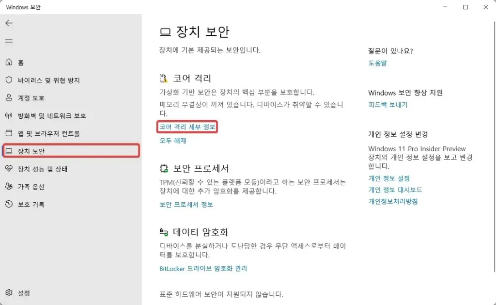 4. 왼쪽 메뉴에서 장치보안을 선택하고 코어 격리 세부정보를 클릭합니다.