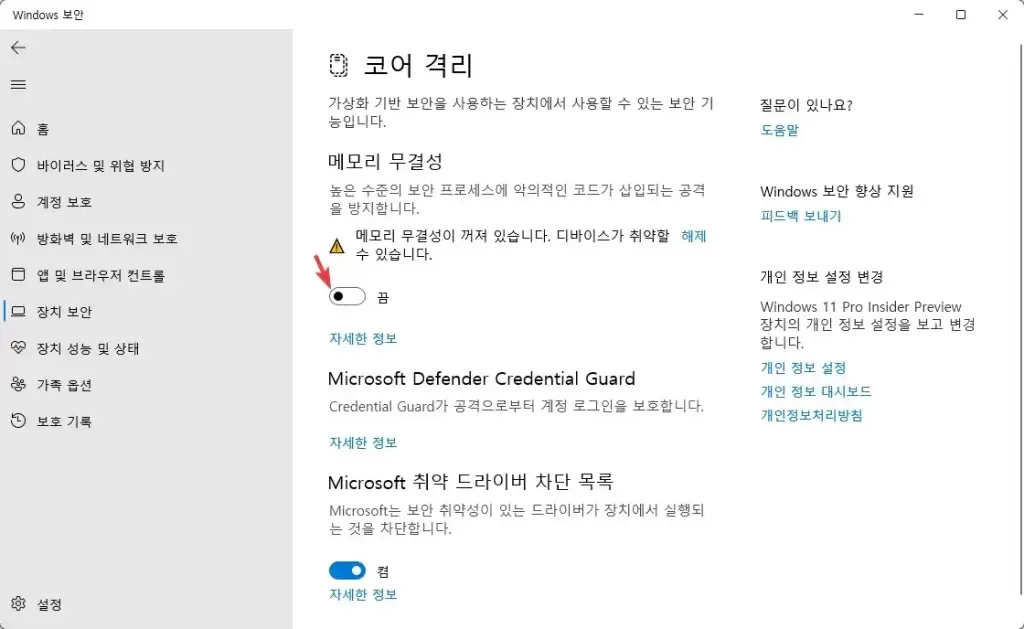게임 성능 향상을 위한 메모리 무결성 비활성화