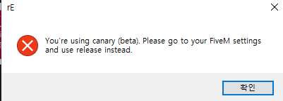이 오류 메시지는 현재 FiveM에서 "Canary" (베타) 버전을 사용하고 있어 발생한 것입니다. 레드는 정식 버전에서만 작동할 수 있으므로, 설정을 "Release" (정식) 버전으로 변경해야 합니다.